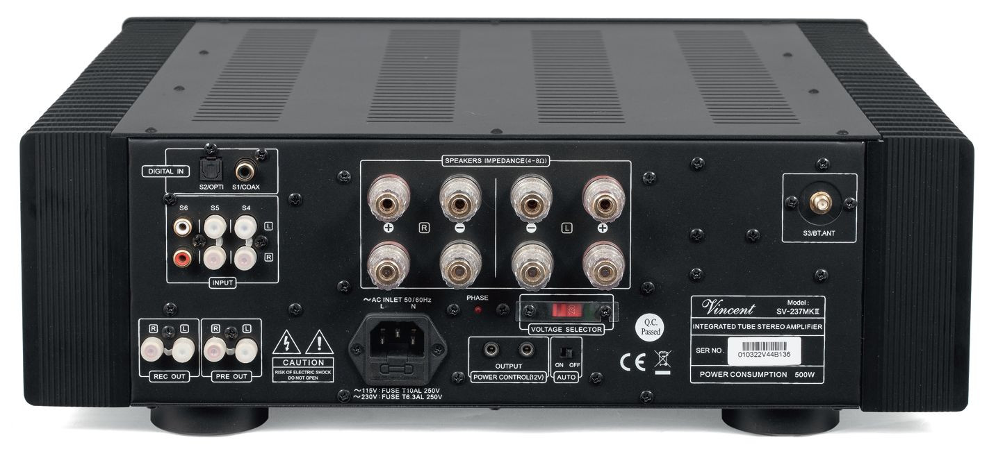 Wejścia analogowe są trzy, wszystkie liniowe (szkoda, że nie ma wejścia gramofonowego). Są też dwa wyjścia liniowe ze stałym i zmiennym poziomem. Kolumny podłączymy do dwóch par zacisków. Można odłączyć system automatycznego czuwania (zasilania), a dla purystów Vincent ma sygnalizację tzw. "fazy", czyli poprawności doprowadzenia do wzmacniacza żyły fazowej.