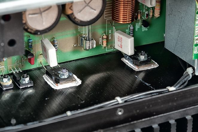 Duży (i dodatkowo ekranowany) transformator toroidalny jest umieszczony z tyłu. W każdym kanale pracują dwie pary tranzystorów wyjściowych, sprawdzonych Sankenów 2SA1386/2SC3519. Tworzą potencjał wystarczający, aby wygenerować deklarowaną przez producenta moc wyjściową (2 x 150 W przy 8 Ω i 2 x 250 W przy 4 Ω) i pracować w klasie A w zadeklarowanym zakresie mocy.