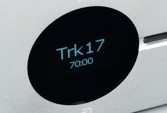 W linii mechanizmu szczelinowego umieszczono dwa przyciski (wysuwania płyty i włączenia zasilania), a po lewej stronie wyświetlacz; w jego okrągłym polu wkomponowano dwa sensory dotykowe obsługi podstawowych funkcji; górne pole uruchamia (i zatrzymuje) odtwarzanie, dolne służy do przełączania źródeł. Inne operacje przeprowadzamy pilotem, niezbędnym już do regulacji głośności czy przeskakiwania pomiędzy ścieżkami na CD.