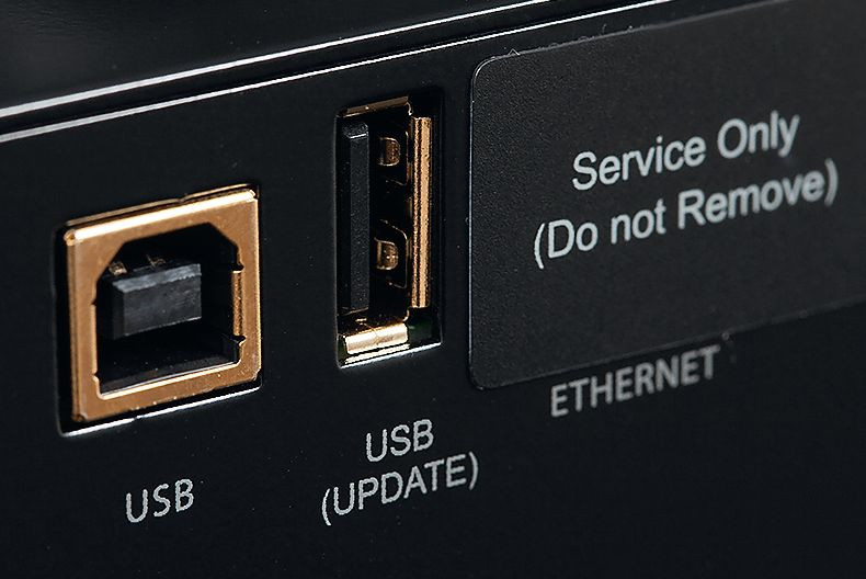 Oprócz wyjść analogowych (RCA jak i XLR) są też dwa cyfrowe (współosiowe i optyczne). Wejść do sekcji cyfrowej jest aż pięć – dwa optyczne, dwa współosiowe oraz USB-B (do komputera); maksymalne parametry to PCM 32 bit/384 kHz oraz DSD256. Złącze USB-A służy do aktualizacji oprogramowania i serwisowania.