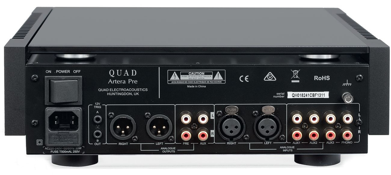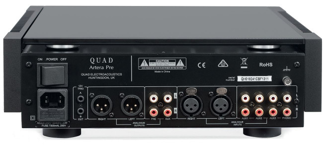 Quad Artera Pre ma w sumie cztery wejścia liniowe – trzy RCA i jedno XLR. Do tego, oczywiście w standardzie RCA, dochodzi wejście gramofonowe, i to w dwóch trybach – MM oraz MC.