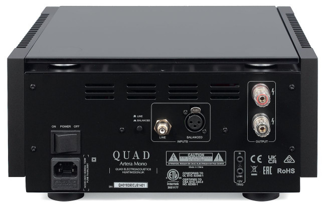 Quad Artera Mono to najmocniejsza końcówka Quada. Szerokość wynosi 32 cm, jednak przez znaczną wysokość i głębokość, a także duże radiatory na bokach, urządzenie prezentuje się poważnie, zachowując też stylistyczną spójność z innymi komponentami serii.