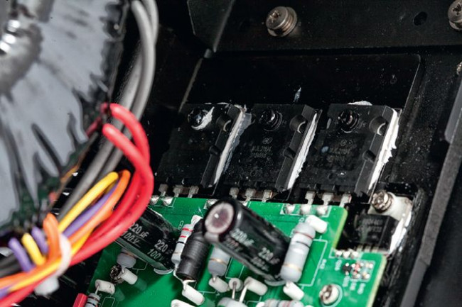 Dlatego na pierwszy rzut oka wygląda to jak stereofoniczna końcówka mocy, ewentualnie zmostkowana, ale na płytkach widnieją oznaczenia Artera Mono. W sumie pracuje dwanaście tranzystorów bipolarnych MJL21194 ON Semi (dawne ON Semiconductor).