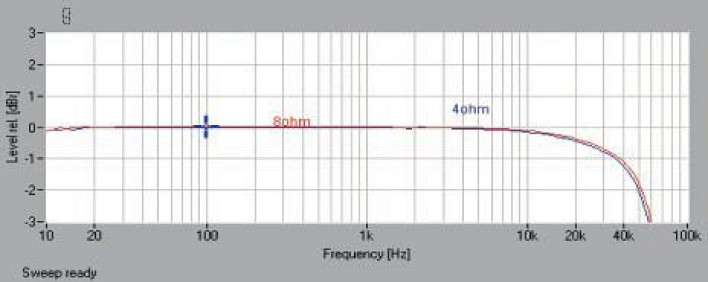 <p>Pasmo przenoszenia (rys.1.) to kolejny trudny test dla wyposażonego w fi ltry wyjściowe wzmacniacza impulsowego, a Primare znów sobie radzi. Przy 10 Hz liniowość jest wzorcowa, spadek pojawia się powyżej 20 kHz, ale -3 dB można wyznaczyć na 60 kHz.</p>