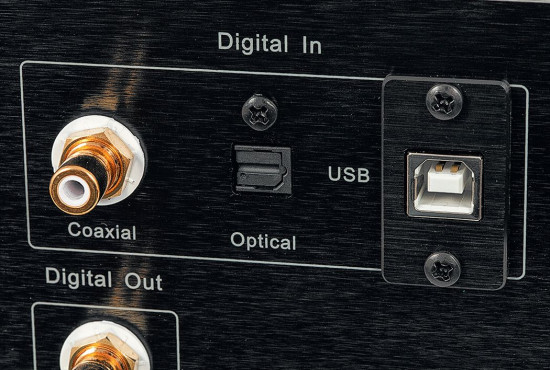 Sekcja wejść cyfrowych to przede wszystkim złącze USB, które przyjmuje sygnały PCM 24/384 oraz DSD128.