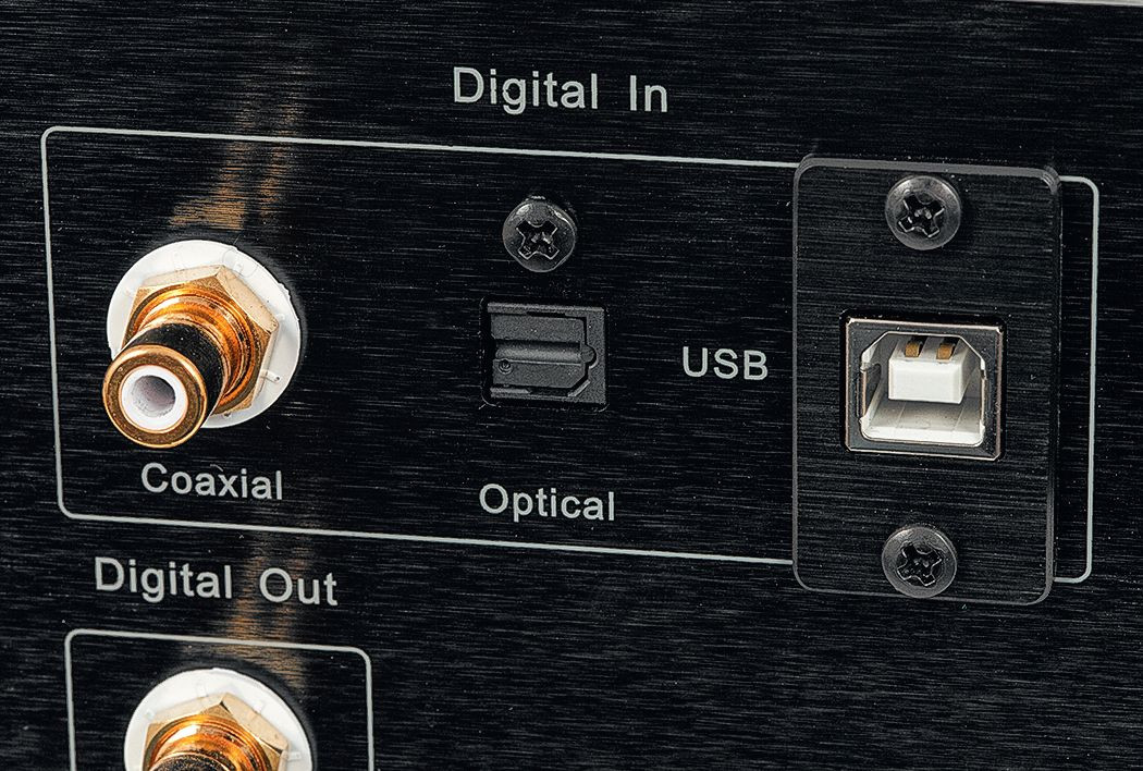 Ustawienie wyjść analogowych na skrajach (tylnej ścianki) sugeruje, że układy wewnątrz zaprojektowano jako lustrzane odbicia, separując obydwa kanały; każdy kanał ma zarówno gniazda RCA, jak i XLR. Wyjście cyfrowe (współosiowe) jest jedno, wejść cyfrowych - więcej, po jednym w każdym głównym standardzie: współosiowym, optycznym oraz USB. Dwa pierwsze przyjmą sygnały PCM o rozdzielczości 24 bitów i częstotliwości próbkowania odpowiednio: 192 kHz i 96 kHz, USB dociera do 384 kHz, przyjmie też sygnały DSD64 i DSD128.