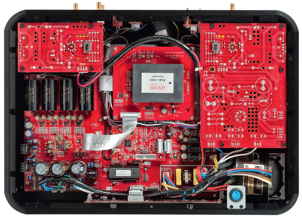 Już na pierwszy rzut oka widać wewnątrz okazałe kondensatory Mundorfa. Płytkę z upsamplerem (a raczej konwerterem formatów) umieszczono nad mechanizmem (stąd jest do niej łatwy dostęp i możliwość domontowania takiej do wersji bazowej urządzenia) i zakryto szarą puszką ekranującą. Nieopodal zainstalowano lampowe obwody wyjść analogowych, zgodnie z przypuszczeniami podzielone między dwie płytki (tuż za gniazdkami RCA/XLR na tylnym panelu), ale jedna z nich zawiera również sekcję zasilającą (dla obydwu kanałów).