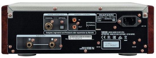 Tylna ścianka HD-CD1 wygląda jak w klasycznych odtwarzaczach CD - analogowe wyjście RCA (o stałym poziomie); dwa wyjścia cyfrowe (jedno optyczne i jedno współosiowe) - to wszystko (i jeszcze złącza sygnałów sterujących).