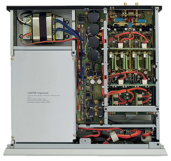 Wewnątrz Luxmana D-10X panuje wzorowy porządek, każda sekcja ma swoją "działkę", najczęściej odizolowaną ekranami. Transport to własna konstrukcja Luxmana o nazwie LxDTM-i, oparta na solidnej dolnej ramie i spięta od góry.