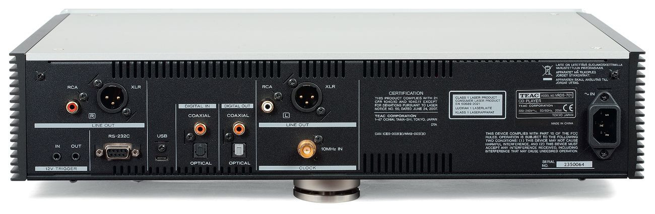 Teac VRDS-701 ma także cyfrowe wyjścia oraz wejście dla zewnętrznego, wzorcowego zegara taktującego, zapewniającego większą dokładność. Teac ma takie urządzenie w ofercie – CG-M10 (7000 zł). Do listy obsługiwanych formatów dochodzi nawet MQA (w Japonii dostępne są płyty CD z sygnałem MQA, ale i tam jest to nisza).