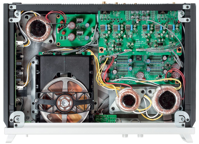 Pierwszorzędnie prezentuje się także zasilanie. Teac VRDS-701 ma aż trzy spore transformatory toroidalne, niezależnie dla obwodów cyfrowych, analogowych oraz… mechanizmu odczytującego płyty. Teac chwali się również architekturą dual-mono, na podstawie tego, że transformator sekcji analogowej ma zdublowane odczepy wtórne. To trochę naciągane… ale niech będzie. Tak czy inaczej, cała konstrukcja jest technicznie imponująca.