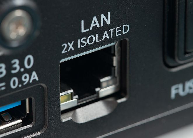 Kieszeń na opcjonalny dysk twardy jest ekranowana. W przedniej części widać radiator dla głównego procesora – to dwurdzeniowa jednostka firmy Intel. Aby zabezpieczyć się przed zakłóceniami z sieci (komputerowej), złącze LAN jest podwójnie izolowane.