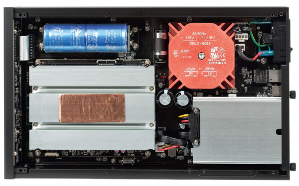 Wewnętrzna konstrukcja Aurendera N150 jest charakterystyczna dla sprzętu komputerowego, z jednym ważnym wyjątkiem. Aurender stosuje liniowe układy zasilające, jest więc duży transformator i kondensatory filtrujące.