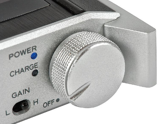 Obok pokrętła znajduje się niewielki hebelek - zgrubny przełącznik zakresów wzmocnienia sekcji analogowej - dzięki któremu w trybach High/Low można dopasować pracę wzmacniacza do parametrów słuchawek, które podłączamy do pojedynczego 3,5-mm wyjścia.