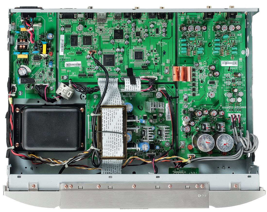 Rozbudowany i podzielony układ zajmuje głównie cztery duże płytki, transformator odseparowano puszką ekranującą.