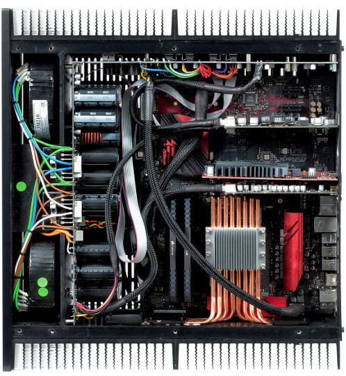 Takie moduły to zaledwie początek szeroko zakrojonych prac nad przekształceniem zwykłego przecież komputera w high-endowy streamer. W wielkiej skrzynce zainstalowano wyjątkowy zasilacz (jak na płytę główną komputera), składający się z trzech sporych transformatorów toroidalnych.