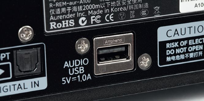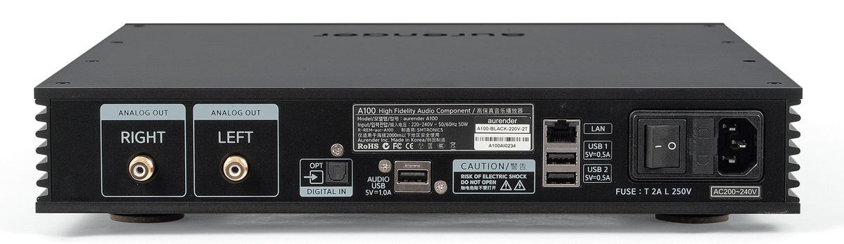 Wyjścia analogowe przygotowano w standardzie niezbalansowanym RCA, poziom sygnału jest na nich regulowany. Dwa złącza USB przygotowano dla nośników pamięci (np. pendrajwów czy dysków twardych) z muzyką, a dodatkowe USB (oznaczone jako wyjście cyfrowe) jest przeznaczone dla zewnętrznych przetworników C/A - jednak nie każdy będzie poprawnie współpracował z A100, więc Aurender przygotował specjalną instrukcję i listę modeli kompatybilnych oraz niekompatybilnych.