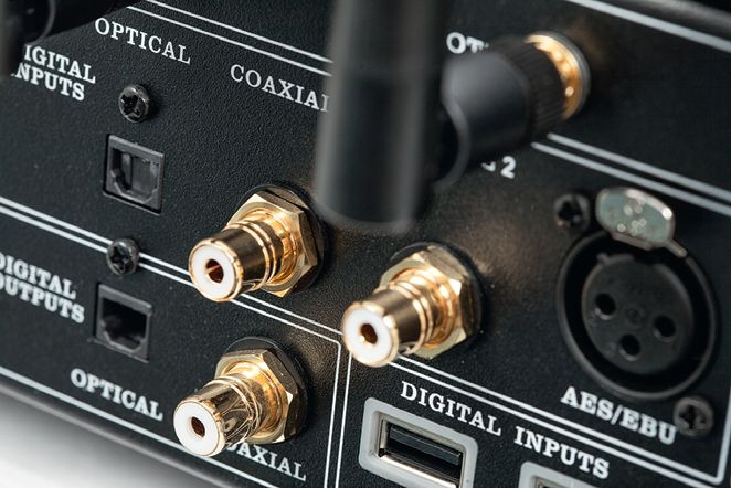 Niezależnie od sieciowej nowoczesności, DM-700 ma również bardziej tradycyjne wejścia cyfrowe: dwa elektryczne współosiowe, jedno optyczne i jedno symetryczne AES/EBU, a obok dwa wyjścia (współosiowe i optyczne).