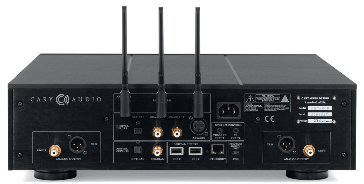 Cary Audio stosuje duże anteny systemów bezprzewodowych, dwie obsługują transmisję Wi-Fi, jedna Bluetooth. Nieco niżej zainstalowano pierwszy (z dwóch) modułów wejść przewodowych z dwoma gniazdami S/PDIF, jednym Toslink oraz jednym AES/EBU. Tylko gniazdo optyczne ma ograniczenie do sygnałów PCM 24/192, pozostałe "sięgają" już znacznie wyżej, aż do PCM 32/768.