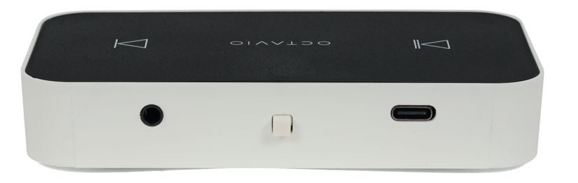 Na górnej ściance Octavio Stream są dwa symbole, które dobrze znamy i kojarzymy z różnymi źródłami. Za grafikami umieszczono nowoczesne sensory dotykowe – rozpoczęcia i wstrzymywania odtwarzania (Play/Pause) oraz przeskakiwania do sąsiedniej ścieżki.