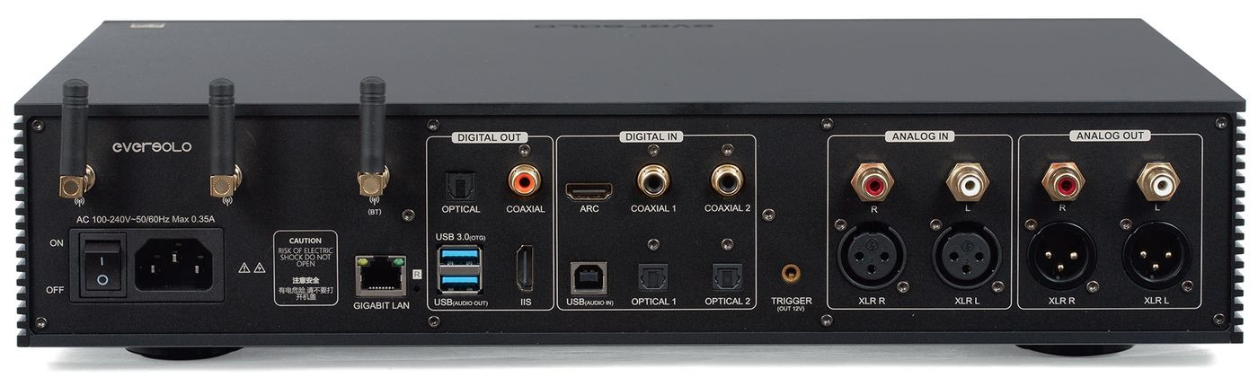 Kolejne USB służy jako wejście dla komputera (USB-DAC), następne – jako wyjście na zewnętrzny przetwornik C/A (chociaż wątpię, aby przy wirtuozerii EverSolo DMP-A8 był on potrzebny). Sygnały cyfrowe podamy także do złącz optycznego, współosiowego, a nawet HDMI (z eARC).