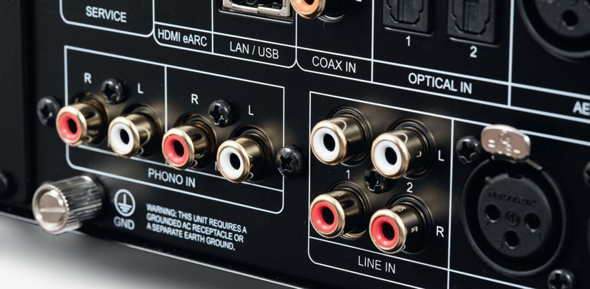 Wśród pięciu wejść analogowych trzy są liniowe (2 x RCA i 1 x XLR), a dwa gramofonowe – niezależnie dla wkładek MM i MC. Obciążenie dla MC wynosi bardzo typowe 100 Ω, dla MM – 56 kΩ (zamiast standardowych 47 kΩ, ale to różnica niewywołująca żadnych komplikacji).