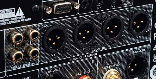 Sygnały wyjściowe (do końcówek mocy, a więc z poziomem regulowanym) są dostępne na gniazdach RCA oraz XLR. M66 ma aż cztery niezależne (i zdublowane, RCA/XLR) wyjścia subwooferowe.