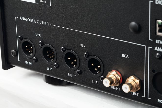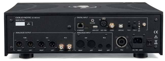 Gold Note DS-1000 EVO (w każdej wersji) ma dwa analogowe wyjścia, RCA oraz XLR, tuż obok jest jeszcze nietypowe złącze oznaczone jako TUBE – to także wyjście analogowe, choć bardzo specjalne, przeznaczone dla firmowej przystawki o takiej nazwie – lampowego stopnia wyjściowego.