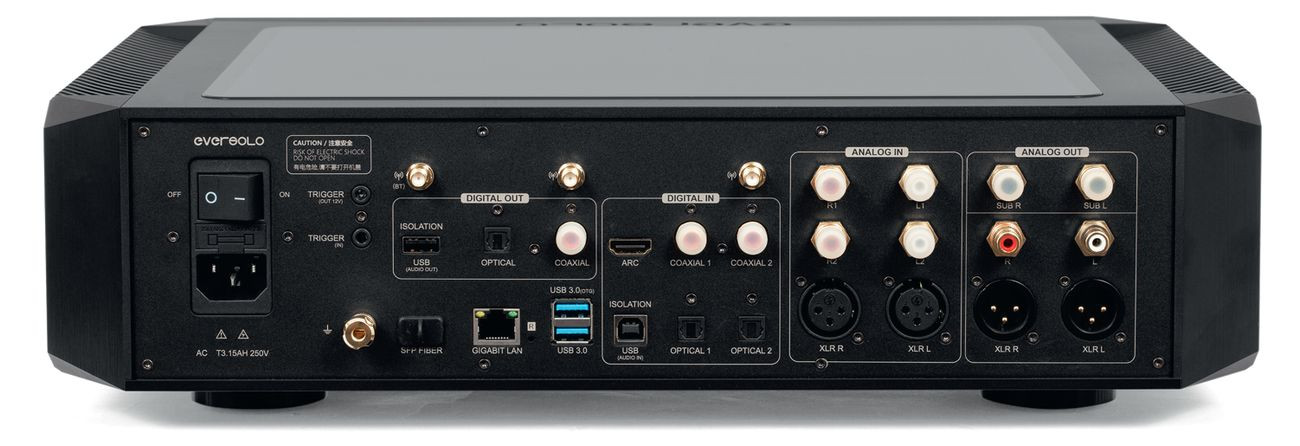Kompetencje Eversolo DMP-A10 wykraczają daleko poza odtwarzanie plików, na co wskazuje też zasobność tylnej ścianki. Do dyspozycji są dwie pary wyjść liniowych (jedna XLR i jedna RCA), są też dwa wyjścia dla subwooferów (z niezależnymi regulacjami).