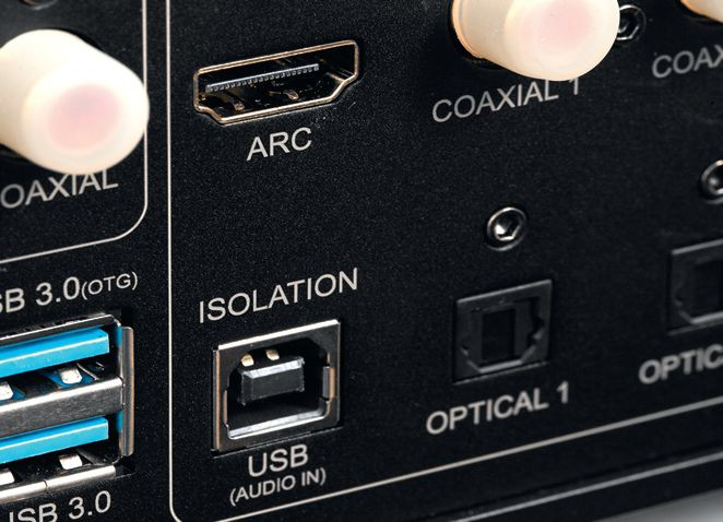 Wejścia cyfrowe są w standardach współosiowym, optycznym, HDMI z ARC oraz USB-B; dwa kolejne USB służą do bezpośredniego podłączenia zewnętrznych nośników pamięci lub – co staje się znowu ciekawsze – napędu CD.