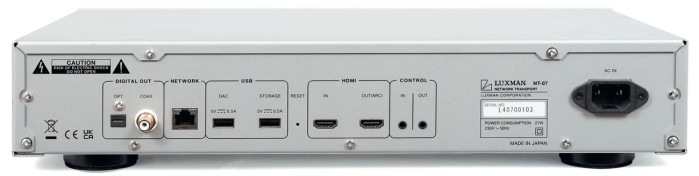 Luxman zakwalifikował NT-07 do kategorii odtwarzaczy cyfrowych, jednak aby uniknąć nieporozumień, lepiej byłoby określać go mianem sieciowego transportu lub napędu, mimo że nazwy te brzmią mało elegancko. Nie chodzi o techniczne didaskalia, ale o fakt bardzo ważny z praktycznego punktu widzenia – NT-07 nie zawiera przetwornika C/A, a więc nie wysyła sygnału analogowego, a urządzenia określane jako odtwarzacze sieciowe są już tak wyposażone.