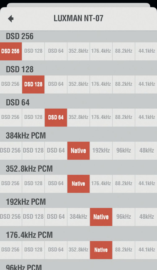 Przetwornik DA-07X nie ma zdalnego sterowania, ale ma je odtwarzacz NT-07. Oprócz pilota fizycznego kusi stworzona specjalnie dla tego urządzenia aplikacja mobilna. Składa się z kilku działów zarówno z funkcjami i ustawieniami podstawowymi (jak np. jasność wyświetlacza czy tryb wyjść analogowych), jak i najbardziej zaawansowanymi, np. z możliwością definiowania pracy upsamplera, i to niezależnie dla niemal wszystkich typów sygnałów wejściowych (plików).