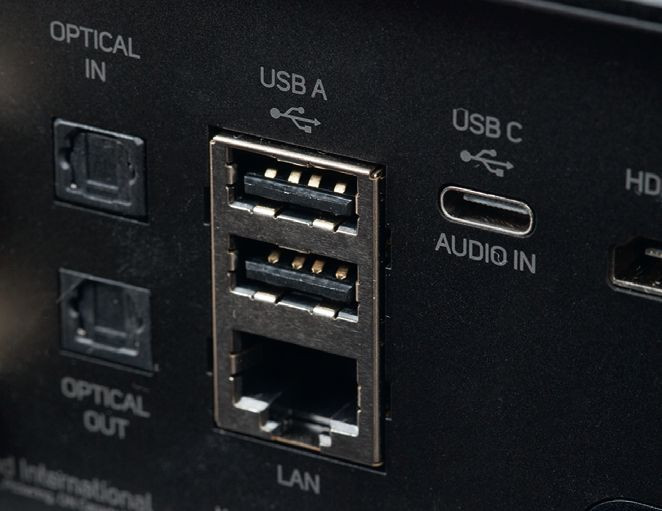 Wśród wejść jest optyczne, USB (dla komputera) oraz HDMI (z kanałem zwrotnym eARC, w dodatku z układem Dolby Digital, co może okazać się przydatne przy sygnałach płynących z telewizora). Do kategorii wejść można także zaliczyć kolejne USB odczytujące pliki z nośników pamięci.