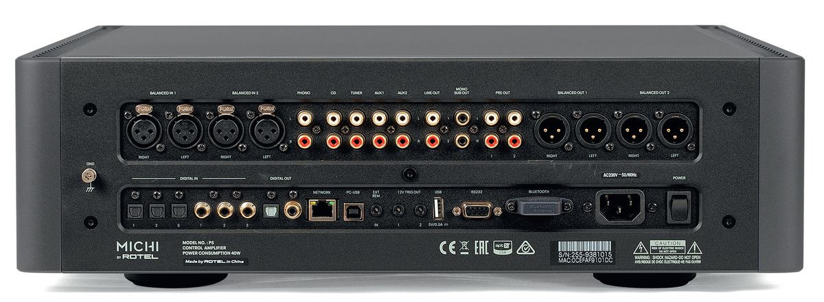 W ustawieniach Michi nie przewidziano innowacji ani rarytasów, których nie znalibyśmy już ze sprzętu... Rotela. Konstrukcja P5 została podzielona na dwa główne moduły, co odzwierciedla układ tylnej ścianki. W górnej części zgromadzono wszystkie gniazda analogowe, w dolnej - cyfrowe wraz z kilkoma dodatkami (sterowanie, zasilanie). Rotel Michi P5 jest przedwzmacniaczem zasadniczo analogowym, który uzupełniono o sekcję DAC.