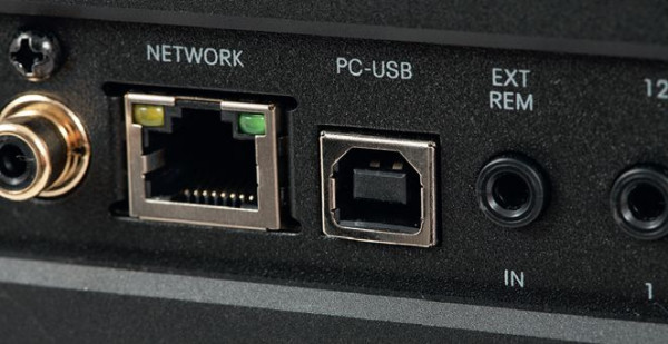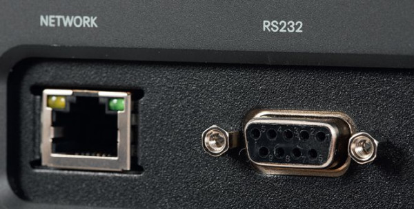 Kompetencje złącza sieciowego LAN ograniczają się do protokołów sterujących. Sterowanie można też realizować za pomocą klasycznego RS232. Nieopodal tego gniazda widać jeszcze drugie złącze USB (typ USB-A) - źródło zasilania.