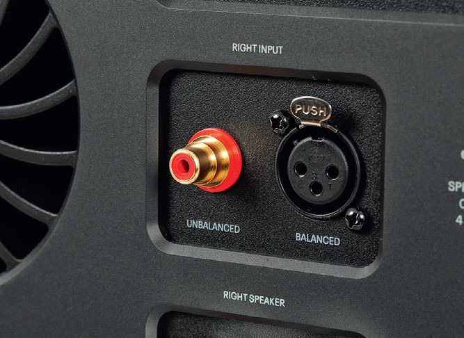 Rotel Michi S5 to układ dual-mono, co widzimy już w kompozycji tylnej ścianki. W każdym kanale mamy do dyspozycji jedno gniazdo RCA i jedno XLR (aktywne wybieramy przełącznikiem) i dwie pary zacisków głośnikowych.