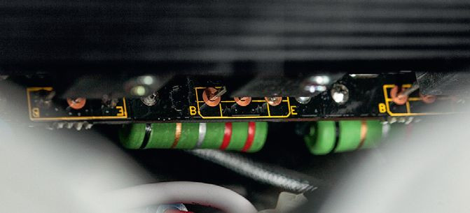Sekcje końcówek są przytwierdzone do dolnych fragmentów radiatorów, na których doliczymy się łącznie 32 tranzystorów wyjściowych (po 16 na kanał).