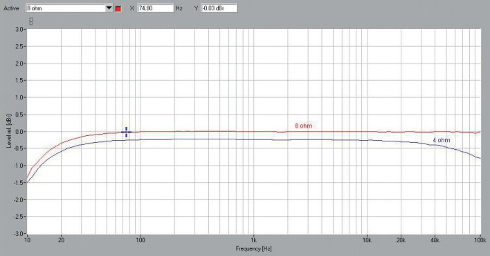 Nie jest to rekord, ale dzięki wysokiej mocy dynamika sięga 110 dB. Znakomicie prezentują się charakterystyki przenoszenia (rys.1), zwłaszcza dla 8 Ω, przy 100 kHz nie ma żadnego spadku, a dla 4 Ω tylko 0,8 dB.