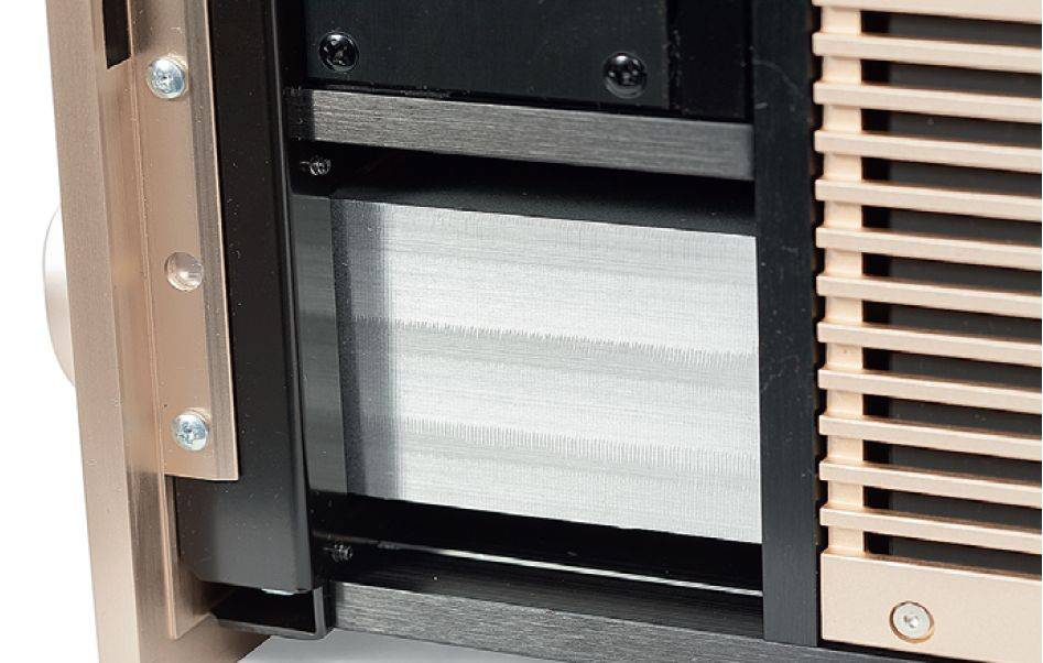 Wewnątrz metalowego bloku znajduje się skomplikowany układ regulatora głośności, dopracowany pod kątem elektronicznym i mechanicznym, aby samemu użytkownikowi jego działanie przypominało tradycyjny potencjometr