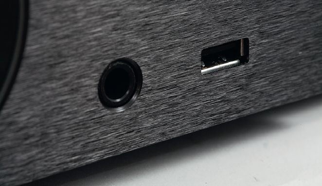 Front urządzono funkcjonalnie i czytelnie. Z lewej strony umieszczono pokrętło regulacji wzmocnienia, złącze USB (dla nośników pamięci z muzyką) i wyjście słuchawkowe.
