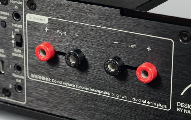 Naim nie odpuścił jednak w obszarze wyjść głośnikowych, które uparcie są niewygodnymi gniazdkami przyjmującymi wyłącznie bananki (budzącymi również sprzeciw zwolenników grubych kabli, zwykle zakończonych widełkami). W komplecie są oczywiście słynne wtyczki – przejściówki, w których można zamocować obrane z izolacji przewody.