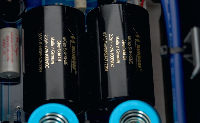 Zbalansowany regulator głośności pozwala sądzić, że sygnały w takiej formie są prowadzone od samych wejść do wyjść XLR. W każdym z kanałów pracują trzy lampy, popularne 6922 (dwie) oraz 6H30 (jedna) – podwójne triody małej mocy, często stosowane w przedwzmacniaczach i stopniach wejściowych wzmacniaczy zintegrowanych. Obok lamp widać ekskluzywne kondensatory sprzęgające Mundorf SilverGold Oil.