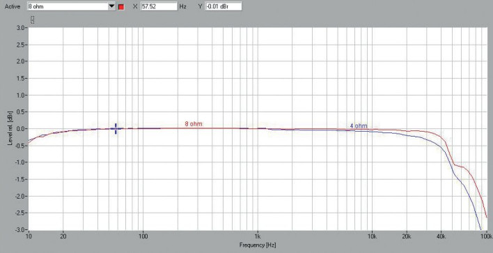 W trybie triodowym charakterystyki częstotliwościowe (rys. 1a) wyglądają świetnie, przy 10 Hz spadek wynosi 0,4 dB, a przy 100 kHz (a więc daleko powyżej granicy pasma akustycznego) – 2,5 dB dla 8 Ω (krzywa czerwona) i 3 dB dla 4 Ω (krzywa niebieska). W tym samym trybie patrzymy na spektrum harmonicznych (rys. 2a); najsilniejsze są druga i trzecia (-67 dB), kolejne nie przekraczają -90 dB.