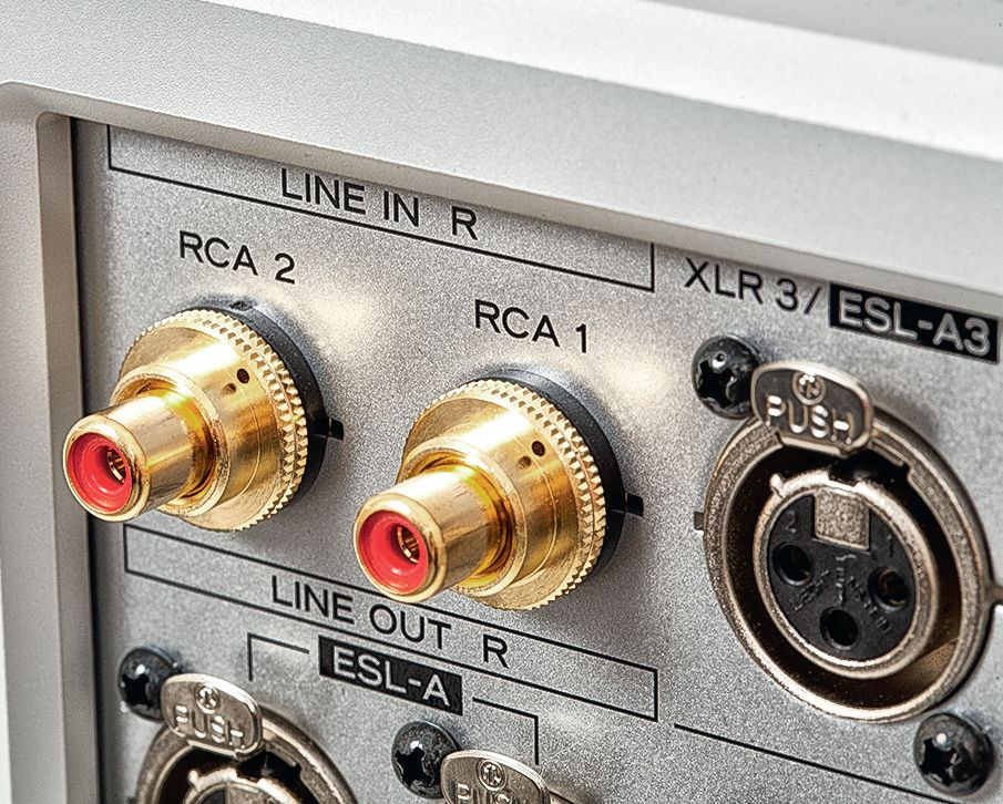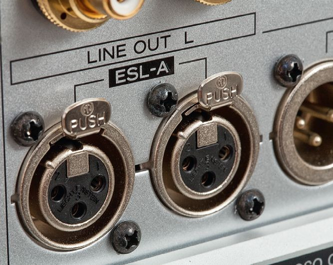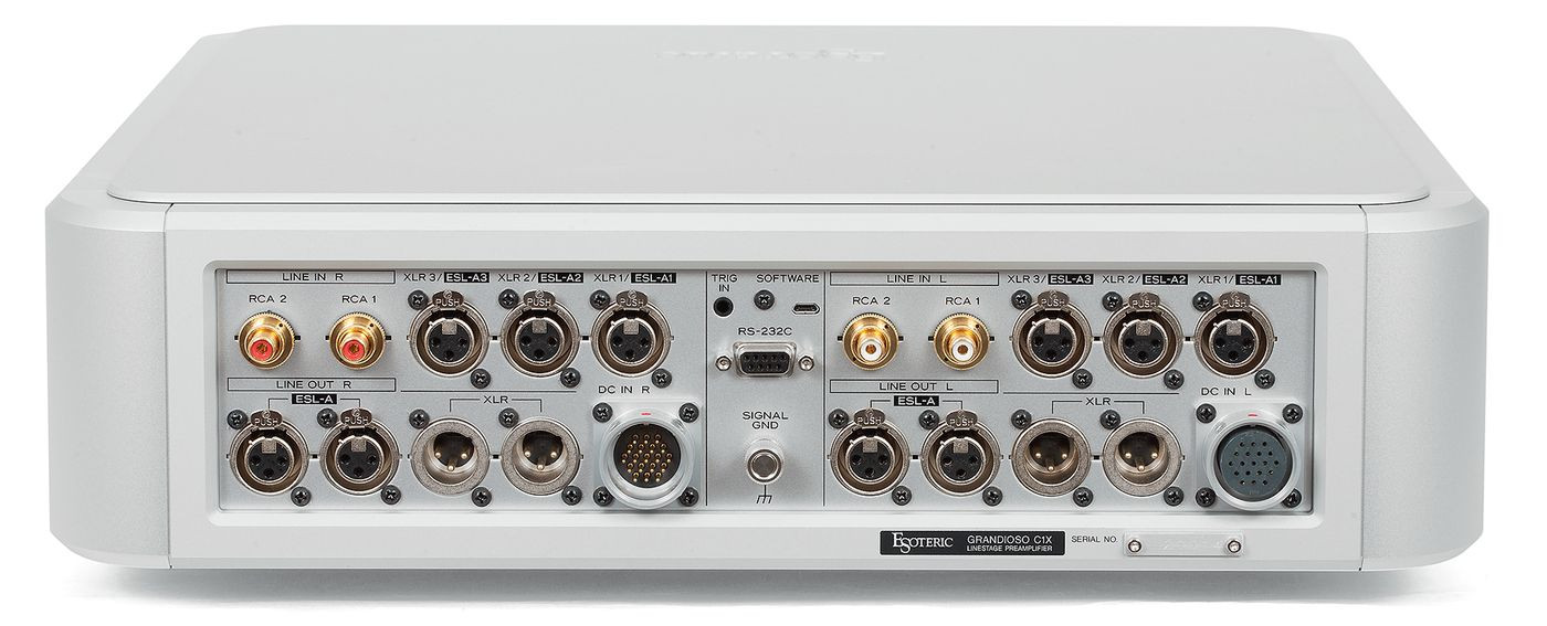 Nieco inaczej przedstawia się sytuacja z połączeniem między przedwzmacniaczem a końcówkami – tutaj także może działać system ESL-A, ale ponieważ potencjalna pomyłka mogłaby mieć katastrofalne skutki, połowa z wyjść Esoteric Grandioso C1X jest na stałe podporządkowana tej formule, a konfiguracja gniazd "odwrócona" (złącze "męskie" znajduje się w końcówce mocy); dzięki temu nie da się podłączyć regularnego wyjścia XLR (przedwzmacniacza C1X) do wejścia ESL-A w końcówce (i odwrotnie).