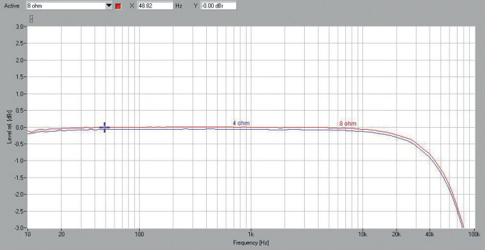 Charakterystyki częstotliwościowe (rys. 1) są bezproblemowe. Przy 10 Hz spadek wynosi zaledwie -0,1 dB, na drugim skraju -3 dB wyznaczamy przy 80 kHz; to oczywiście częstotliwości leżące daleko poza pasmem akustycznym. Charakterystyki dla obydwu obciążeń są niemal idealnie zbieżne.