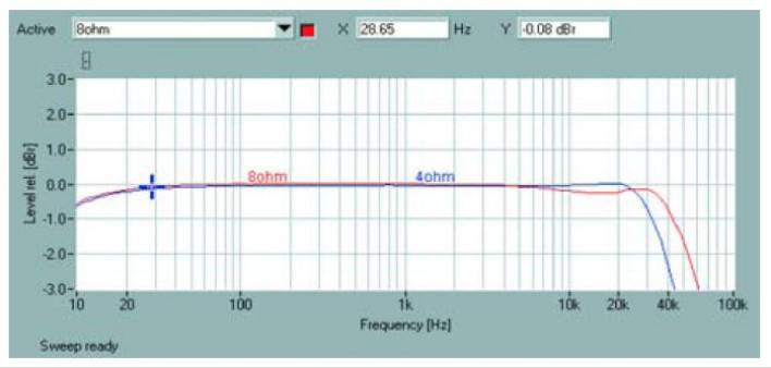 Pasmo przenoszenia (rys. 1) to dla wzmacniacza impulsowego zawsze test nie najłatwiejszy, za co odpowiedzialne są filtry wyjściowe. W tym przypadku idealną liniowość, aż do 22 kHz, zachowuje krzywa 4-omowa, podczas gdy obciążenie 8-omowe, mimo lekkiego osłabienia w tym zakresie, oferuje nieco wyższą częstotliwość graniczną (61 kHz vs 42 kHz). W obszarze niskich częstotliwości w każdym przypadku wzmacniacz spisuje się świetnie, ze spadkiem zaledwie -0,6 dB przy 10 Hz.