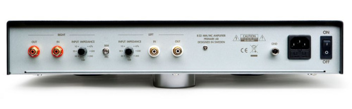 Front Primare R32 zdobi frezowane logo firmy i dioda LED, pokazująca zasilanie. Wszystkie manipulatory znalazły się z tyłu. Zamiast wszechobecnych przełączników typu DIP mamy wygodne gałki, osobne dla każdego z kanałów. Możemy zmienić nimi impedancję obciążenia (7 kroków: 10, 20, 50, 100, 200, 500 omów i 47 kiloomów).