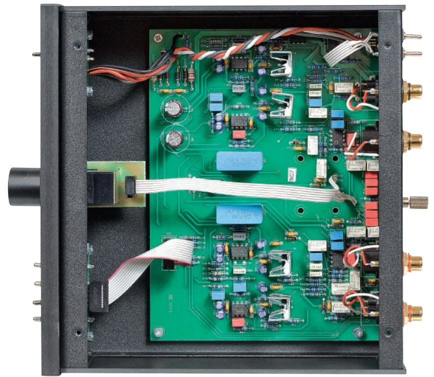 RIAA, albo tzw. "Decca" (bo to nie był standard per se). Na wyjściu sygnał jest buforowany w stojących na nóżkach, chłodzonych niewielkimi radiatorami układach scalonych Linear Technology LT1010. W części korekcyjnej widać precyzyjne oporniki i bardzo dobre kondensatory polipropylenowe.