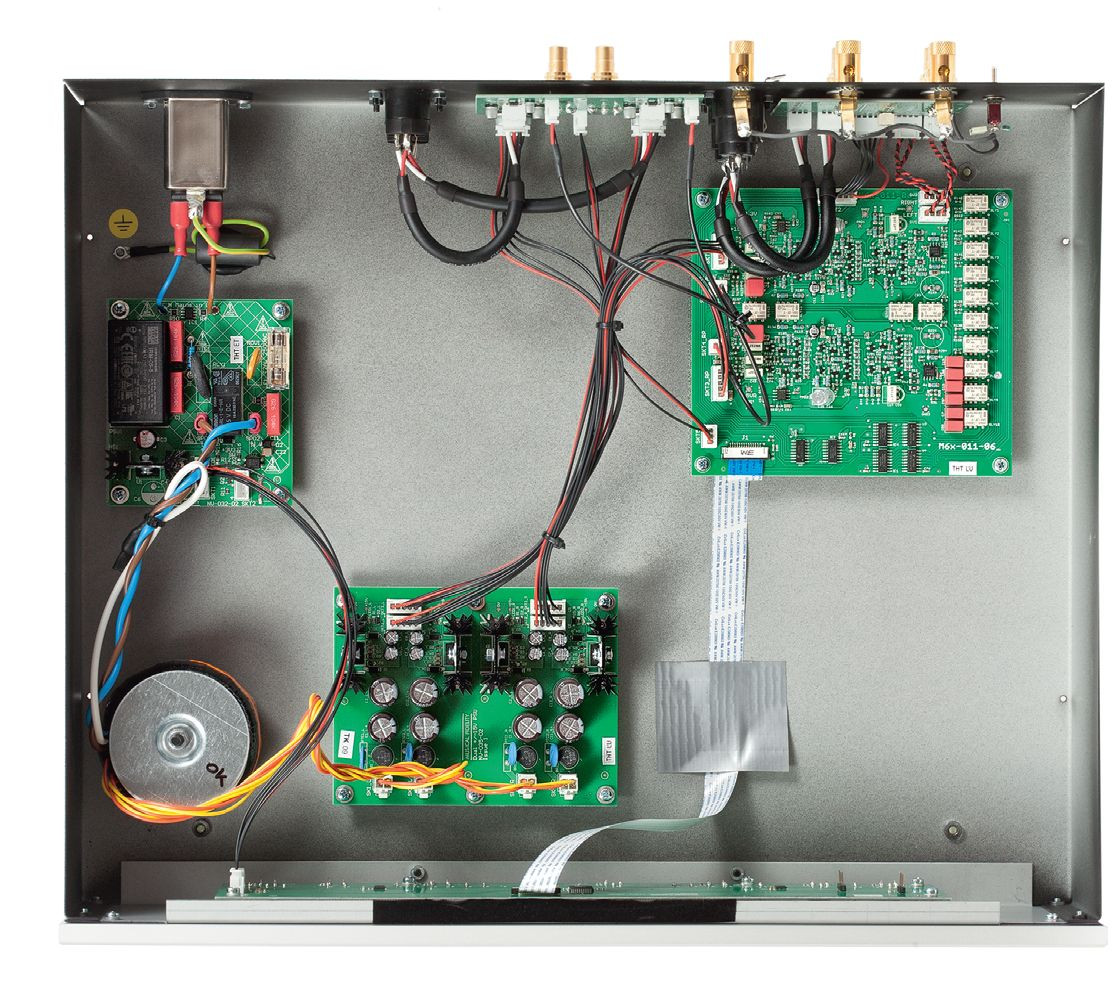 Duża obudowa Musical Fidelity M6x Vinyl oznacza… sporo wolnej przestrzeni, co doskonale widać po zdjęciu górnej pokrywy. Wewnątrz swobodnie zmieściłby się jeszcze jeden, a może nawet dwa kompletne układy. Wszystkie obwody zajmują aż pięć płytek drukowanych. Zasilacz jest częściowo liniowy (główna sekcja audio), a częściowo impulsowy (tryb czuwania).