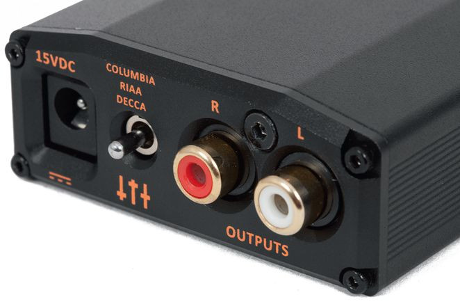 Z jednej strony podłączamy gramofon, mamy do dyspozycji dwie pary wejść RCA (jedna dla wkładek MC, druga dla MM) oraz trzpień masowy. Z drugiej strony wyjściowa para RCA i gniazdo dla zewnętrznego zasilacza.
